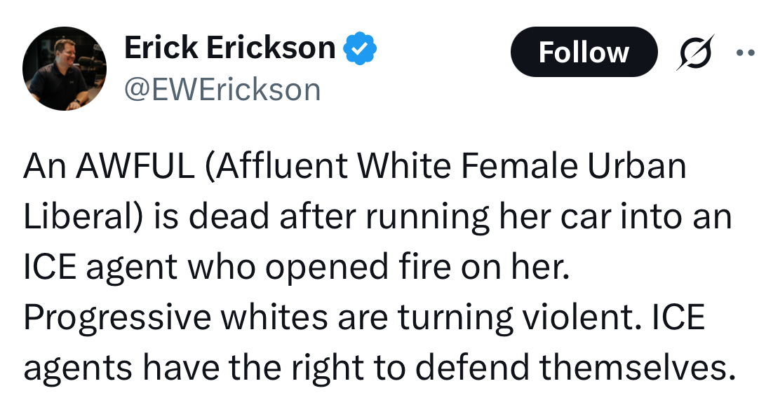 But what is very unmistakable when you read these short claims is that these people liked seeing this woman get shot. It’s not a tragedy to them wherein somebody made the wrong call and now an innocent person is dead. She should be dead—because she represents an entire group of people they find deeply, deeply annoying.