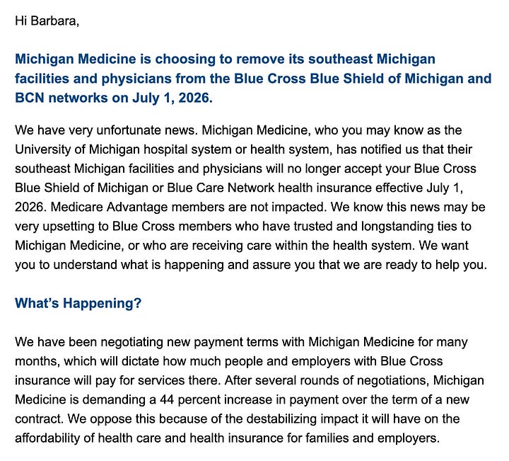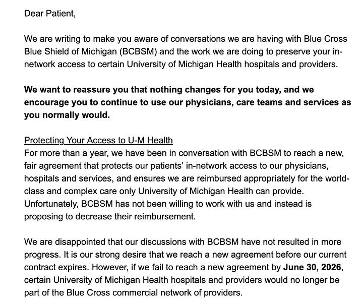 So I’ve tried to resist my initial reaction of blaming BCBSM for everything and have looked for further reporting on this situation. There are two sets of competing claims: BCBSM states that Michigan Medicine is demanding a 44% increase in what the insurer pays the hospital. Michigan Medicine’s response is: that is false, that they’ve only asked for single-digit increases in payment, and that BCBSM actually wants to cut their current payments by 30%. Can they both be telling the truth in some technical sense? Yes, I think so, but I will put my speculation in a footnote because my math could be wrong or it could be right in theory but one of them could actually just be lying after all.1