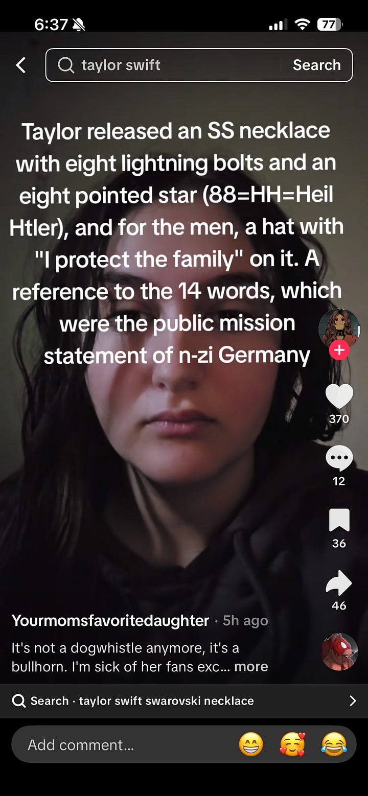 This is, sorry, way too many Taylor Swift posts in a row, but something genuinely and troublingly weird is going on with The Life of a Showgirl, reception of. There is a persistent attempt out there, particularly on Reddit, Twitter, and TikTok, to paint this album as very racist, even as flirting with neo-Nazi imagery. So many new talking points arise that the rhetorical effect is that you want to end up conceding some of the minor charges just so that you can seem reasonable when you say “no, a necklace with lightning bolts on it is not winking toward the SS.”