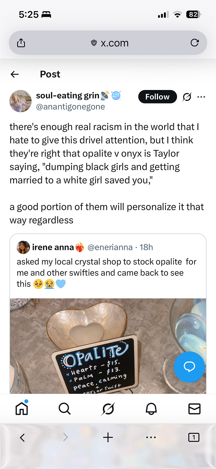 Also: Many, many fans of Taylor Swift are not white. You can go on TikTok and find lots of Black fans who are bewildered and angry at this inane conversation. Treating these people like they don’t matter and don’t exist because for your arguments only the white fans really count is, in my opinion, actually racist.
