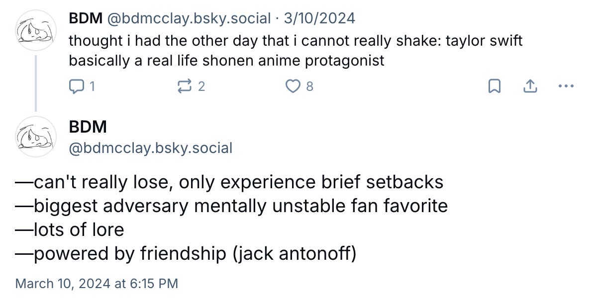 But you don’t need to engage with her that way. You can focus on the music and then you are free to decide what things mean. Speaking quite truthfully, I barely ever think about Taylor the person when I’m actually listening to her music, with the exception of her “bad girl” songs on reputation (and now “CANCELLED!”). If I listen to a sad song, I don’t think “Taylor must have been so sad.” Often, I barely think about me. I love The Tortured Poets Department; it’s a top three Taylor album for me. I can listen to it over and over and not get tired of it. I don’t “identify” with it. I just think it’s got great storytelling. And to go to Taylor herself, I don’t exactly identify with her either, but I root for her like she’s a shonen anime hero. We could say, that is also great storytelling.