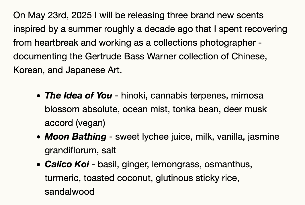 Cirrus! Our first returning brand. Cirrus and Odette are my two big favorites from my time spent sampling perfumes, but Cirrus is slightly more budget friendly and a bit more unpredictable in its scent profiles, so while I’ve been letting new Odette releases stack up until it feels worth it to pay for shipping, I’ve found staying up on Cirrus’s releases pretty easy.